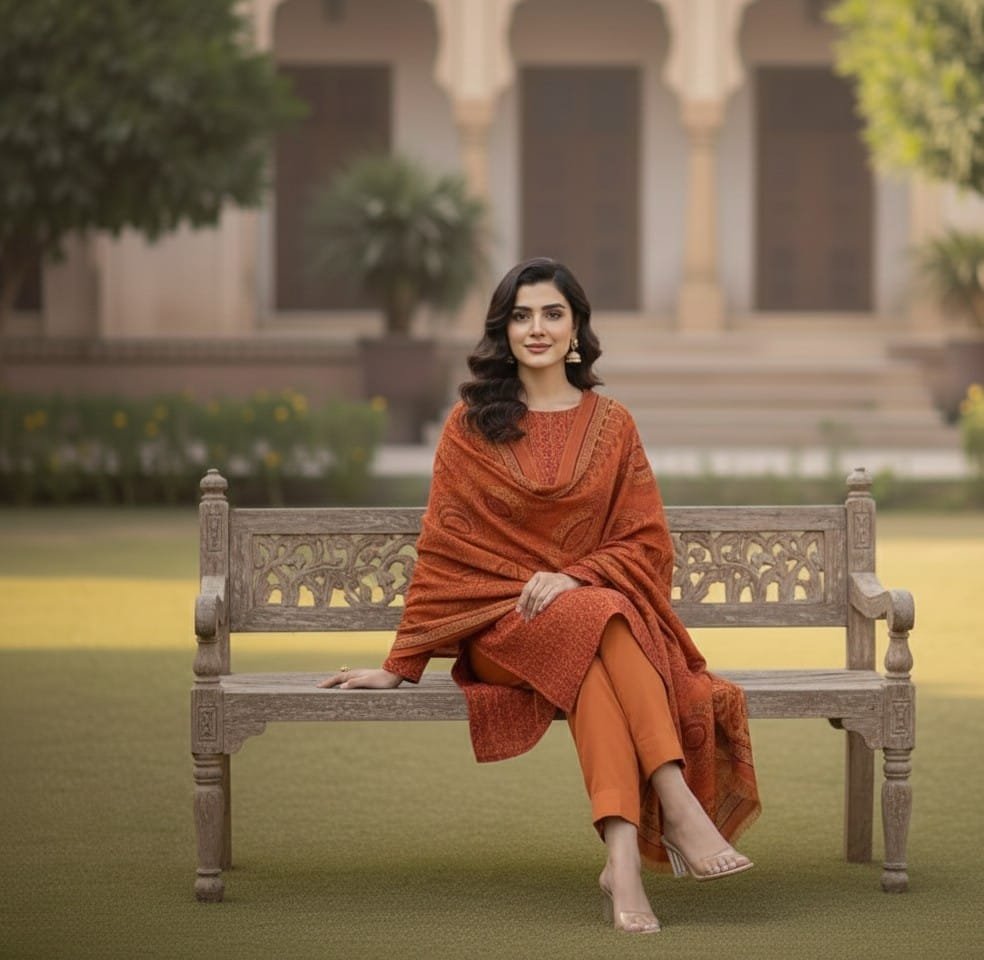 Mustard orange printed 3pc khaddar suit